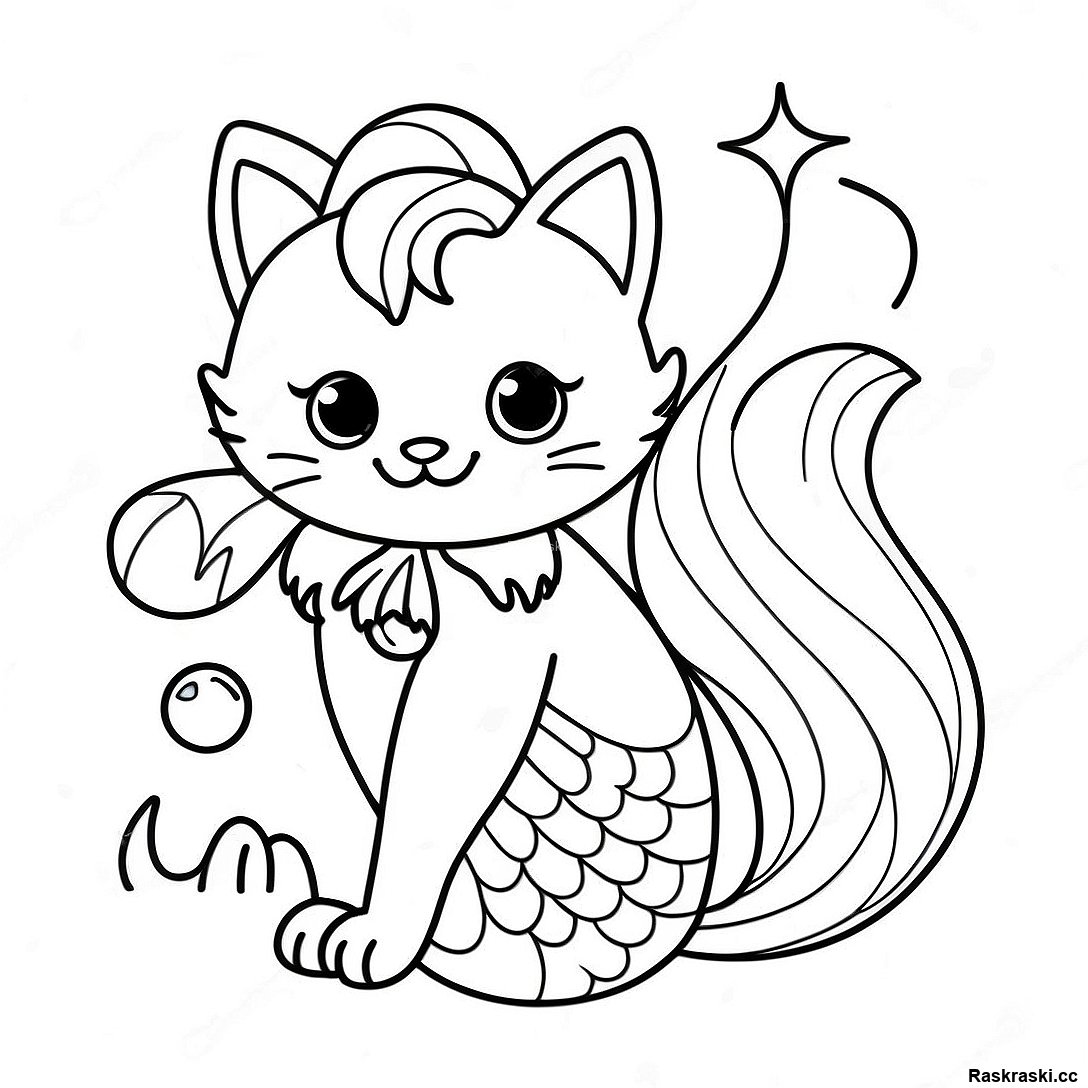 Элегантная Русалка-Кошка С Развивающимися Волосами На Раскраске