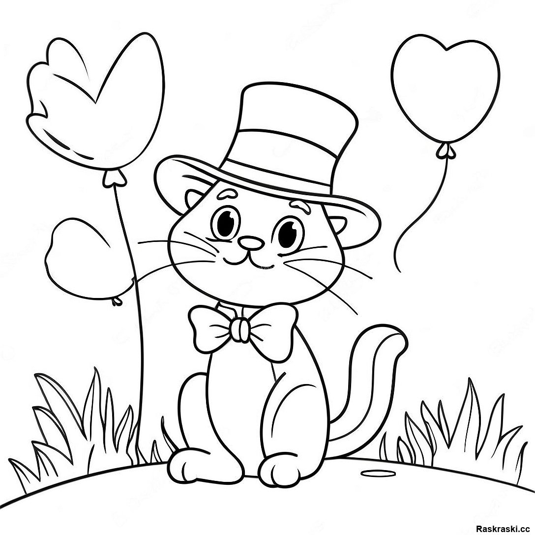 Скачать печатный PDF Кот В Шляпе С Разноцветными Шарами - Раскраска