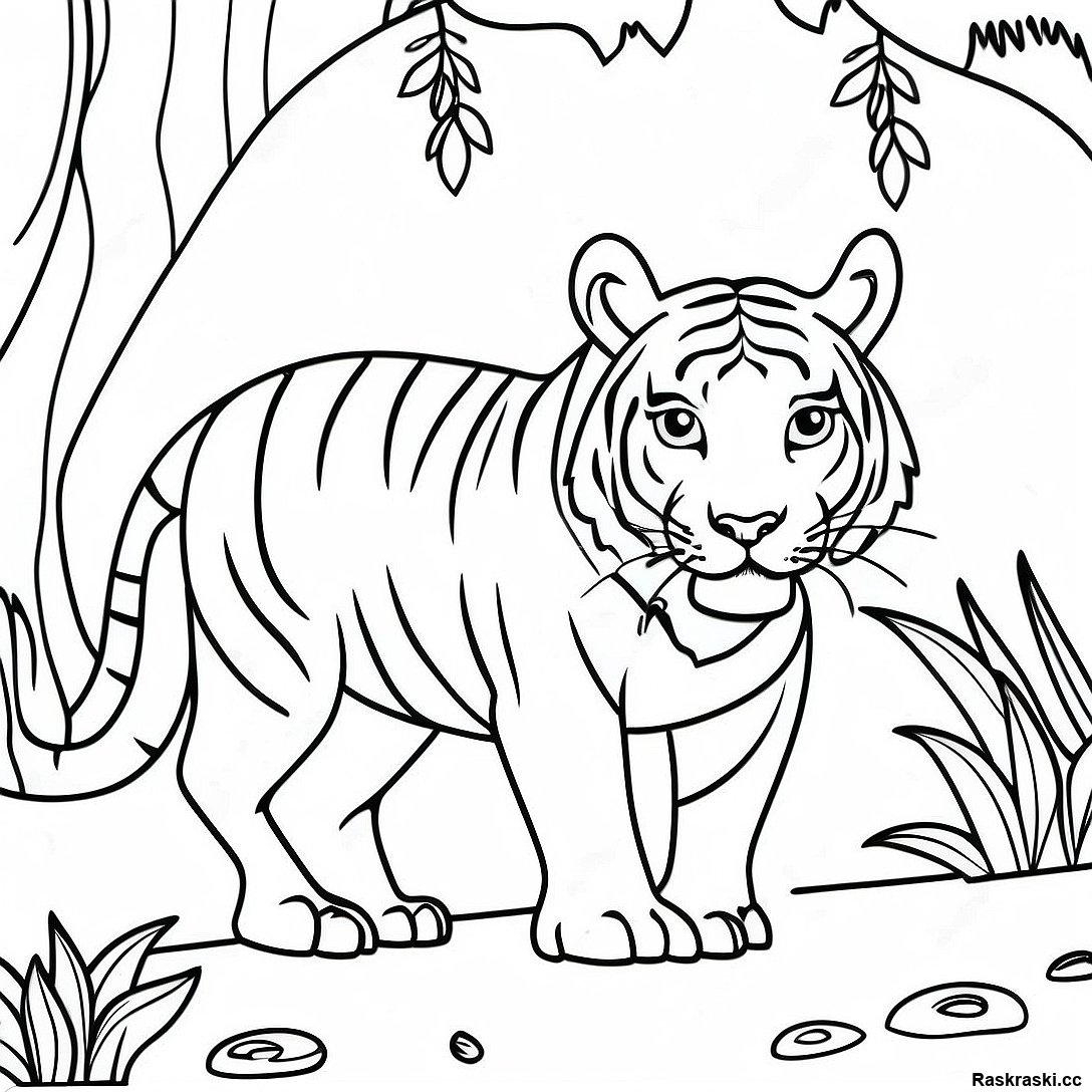 Скачать печатный PDF Раскраска Яростного Тигра, Подкрадывающегося В Джунглях